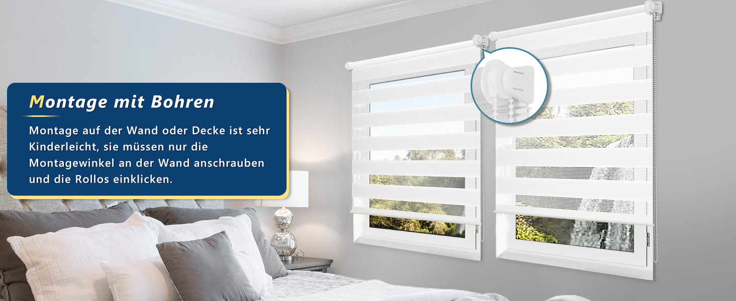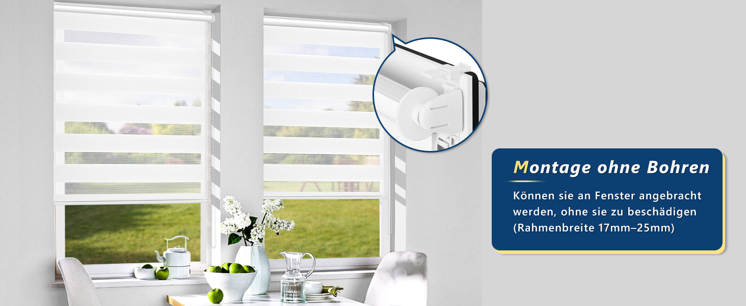 🌳Die Montage ist wahlweise mit oder ohne Bohren möglich: 1. Montage ohne Bohren: Die Jalousie wird mithilfe von Clip-Halterungen am Fensterrahmen befestigt. Geeignete Rahmenstärke: 17 mm bis 25 mm. Die Anpassung an die Fenstergröße ist ohne Bohren möglich. 2. Doppelrollos können auch mit Schrauben an Decke oder Wand befestigt werden. Hierfür ist Bohren erforderlich. Die Zugschnur kann links oder rechts angebracht werden.